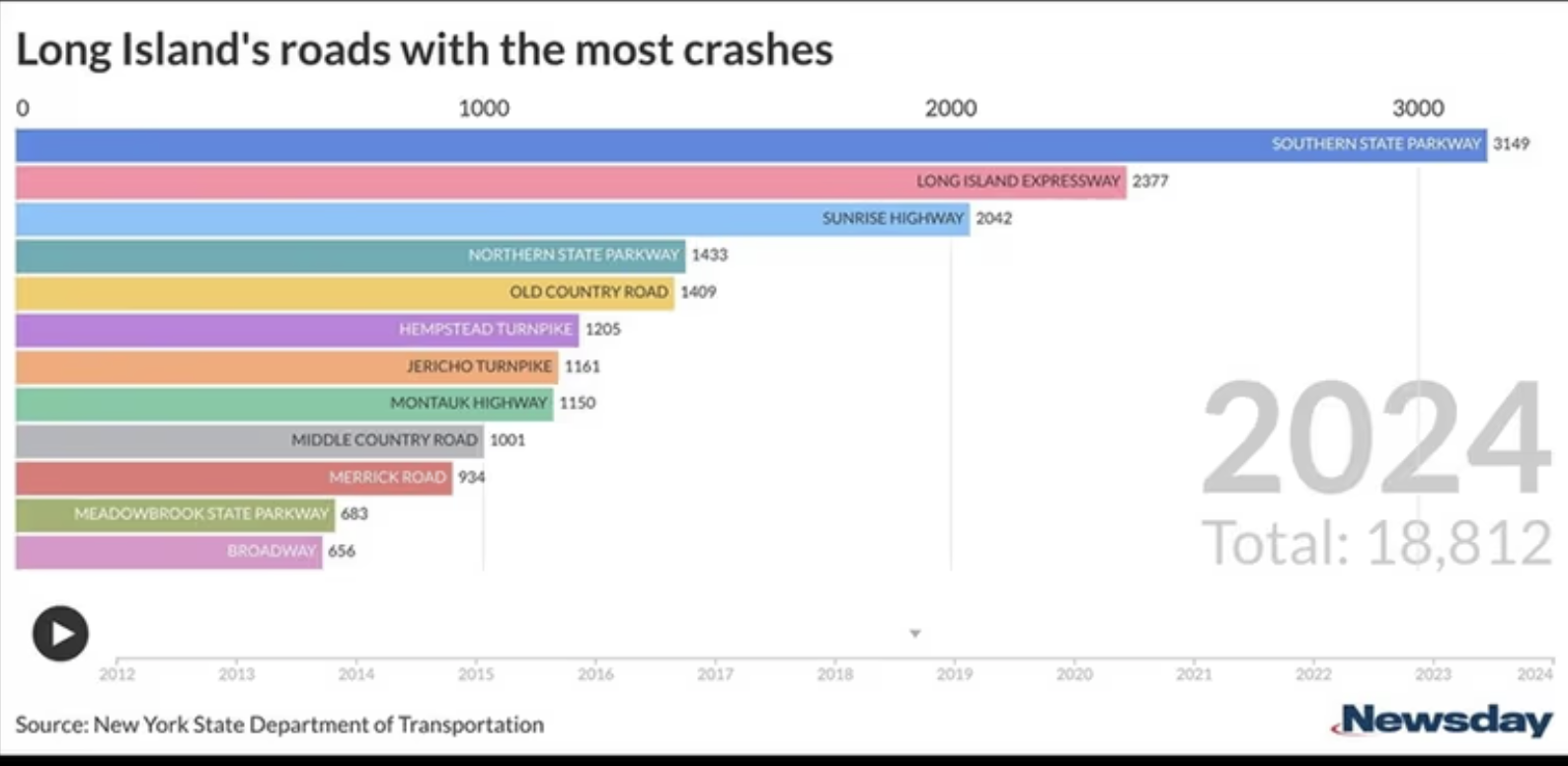 Built an interactive map identifying the most dangerous roads on Long Island, color-coded to indicate fatalities and serious injuries. The map was built as part of Newsday’s year-long Dangerous Roads series. This map was the among the top stories of the year in user metrics.